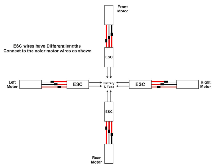 電機1和電機3逆時針旋轉,電機2和電機3逆時針旋轉。我們將使用飛行天空發(fā)射器設置所有電機的方向。首先將電池連接到電源插座上。我們將第一個電機ESC連接到接收器的通道3,通道3始終是節(jié)流的?,F在,打開變送器并稍微移動油門,然后電機將旋轉。現在,觀察電機的方向。如果我們看到方向相反,我們將電機和ESC連接的端線反向?,F在,再次移動節(jié)流閥,我們可以看到電機在期望的方向旋轉。現在,對每個電機重復同樣的步驟。電機和ESC都有3根電線,我們將像下圖一樣連接電機和ESC。