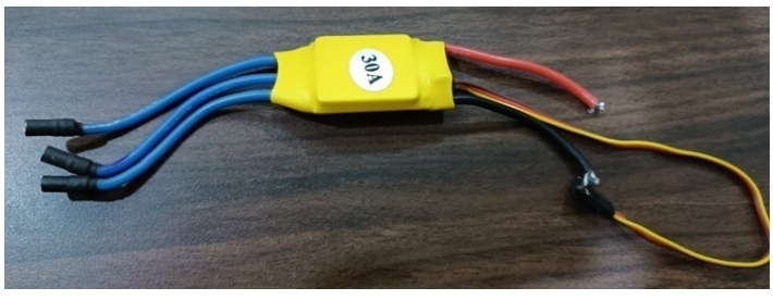 無刷電機是三相電機,不能用直流電源操作。ESC連續(xù)產生三個相位不同但可控的頻率信號,保持電機轉動。它有一個電池輸入和三相輸出的電機。我們這里使用的是30安培的ECSs。在下面的圖片中,我們可以看到ESC的樣子。我們將為四個不同的馬達使用四個esc。