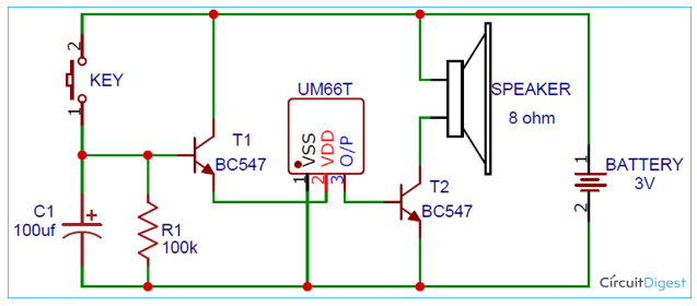 晶體管T2驅動揚聲器。UM66 IC的引腳3連接到晶體管T2的底座。由于IC引腳3的輸出電流可能非常低,因此在編程聲音在給定區(qū)域內變得響亮和可聽之前,需要進行放大。晶體管T2用于接收來自IC輸出引腳的微弱聲音信號,并通過連接的8歐姆揚聲器將其放大。