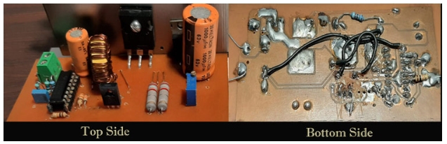為了演示這種大電流升壓變換器,電路是在手工PCB上構建的,并借助原理圖和PCB設計文件[Gerber文件];請注意,如果您將大負載連接到此升壓轉換器電路的輸出,則大量電流將流過PCB走線,并且走線有可能燒毀。因此,為了防止PCB走線燒毀,我們盡可能地增加了走線厚度。此外,我們還用一層厚厚的焊料加強了PCB走線,以降低走線電阻。