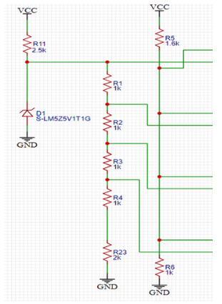 首先,我們需要決定在電路中要測量的電壓水平,然后您可以相應(yīng)地設(shè)計(jì)基于電阻的電位分壓器電路。在這個(gè)電路中,D2是一個(gè)參考齊納二極管,其額定電壓為5.1V 5W,因此它將調(diào)節(jié)輸出到5.1V。有4個(gè)1k電阻串聯(lián)到GND上,因此我們將用于與電池電壓進(jìn)行比較的每個(gè)電阻上都會(huì)有大約1.25V的下降。用于比較的參考電壓約為5.1V、3.75V、2.5V和1.25V。