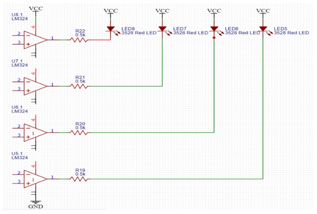 在電路的這一部分中,我們只是為不同的電壓水平驅(qū)動(dòng)不同的led。由于IC LM324是基于OPAMP的比較器,因此每當(dāng)特定OPAMP的非反相端處于比反相端更高的電位時(shí),OPAMP輸出將被拉高至大約VCC電壓水平,這是我們的情況下的電池電壓。這里的LED不會(huì)亮,因?yàn)樵贚ED的陽極和陰極的電壓是相等的,所以沒有電流會(huì)流動(dòng)。如果反相端子的電壓高于非反相端子的電壓,則OPAMP的輸出將被拉到GND電平,因此LED將亮起,因?yàn)樗谄鋬啥司哂须娢徊睢?