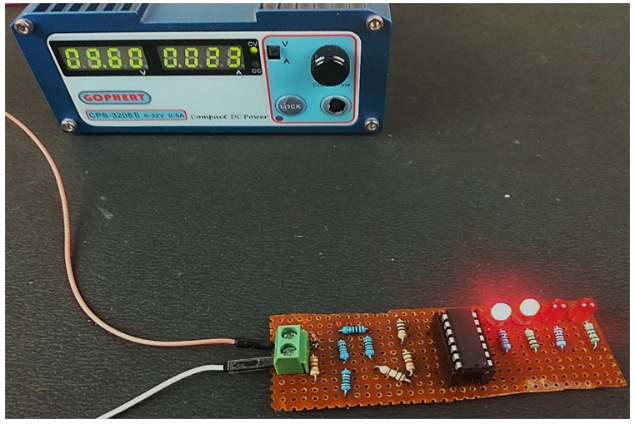 在我們的電路中,我們將每個(gè)OPAMP的非反相端子連接到連接在電池上的電位分壓器電路的1kΩ電阻上,反相端子連接到連接在齊納上的電位分壓器的不同電壓電平上。因此,每當(dāng)電池的分配電壓低于該OPAMP的相應(yīng)參考電壓時(shí),輸出將被拉高,LED將不亮,如前所述。