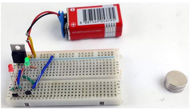 連接電路后,如上圖所示,使用9V電池為設置供電。最初,led將處于高狀態(tài)?,F(xiàn)在將磁鐵靠近磁鐵傳感器,如果您將南極靠近紅色LED,它將關閉,如下圖所示