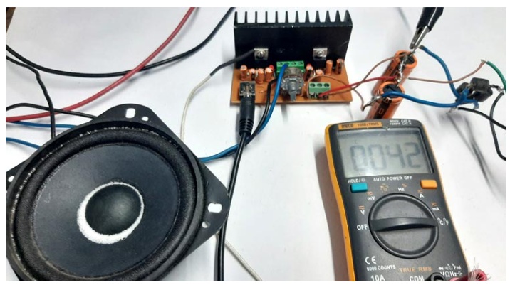 此外,您可以看到在測試期間室溫為31°C。此時(shí)放大器處于關(guān)斷狀態(tài),萬用表顯示的只是室溫。在測試的時(shí)候,我在低音炮的錐體中添加了一些鹽來顯示低音,它在這個(gè)電路中產(chǎn)生的低音會很低,因?yàn)槲覜]有使用音調(diào)控制電路來增強(qiáng)低音。我將在下一篇文章中做這個(gè)。