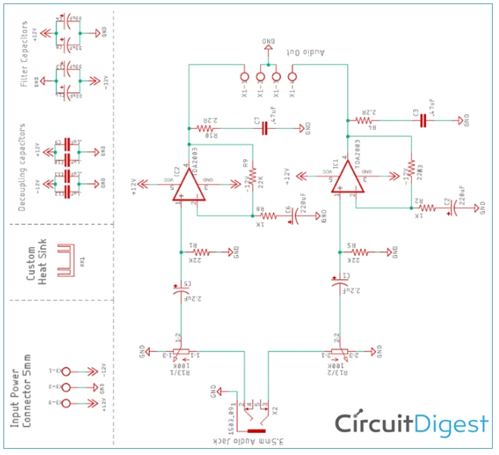 TDA2050數(shù)據(jù)表上的示例電路表明,IC可以由單個(gè)或拆分電源供電。在本項(xiàng)目中,將使用雙極性電源為電路供電。