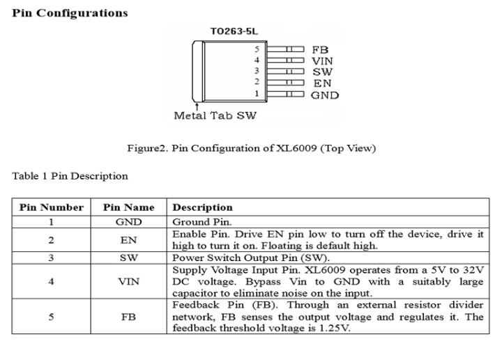 金屬卡扣與XL6009驅動ic的開關引腳內部連接,引腳說明見上表。XL6009集成電路的主要技術指標如下