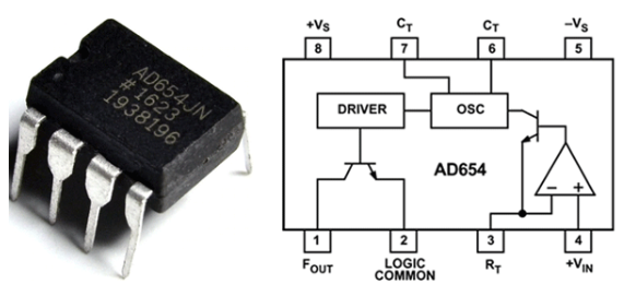 AD654是一款電壓到頻率轉(zhuǎn)換器IC,采用8引腳DIP封裝。它由一個輸入放大器,一個非常精確的內(nèi)置振蕩器和一個高電流開路集電極輸出驅(qū)動器組成,它允許IC驅(qū)動多達12個TTL負載,光耦合器,長電纜或類似負載,并且可以在(5-30)伏之間工作。另一件要提到的事情是,與其他IC不同,AD654 IC輸出方波,因此微控制器很容易測量讀數(shù)。下面列出了該芯片的一些最有趣的功能。