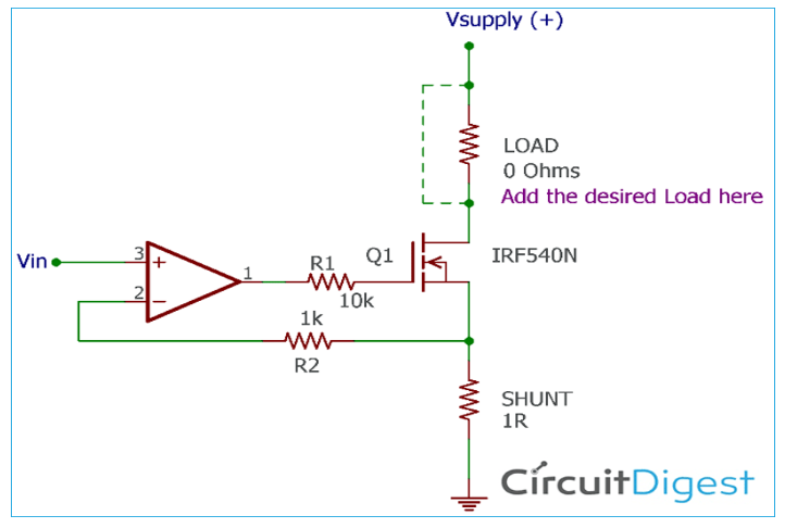 在這種情況下,如果我們像原理圖中所描述的那樣串聯(lián)一個(gè)負(fù)載(電阻負(fù)載),在電源的正極和MOSFET的漏極引腳之間,運(yùn)算放大器將打開(kāi)MOSFET,并且通過(guò)產(chǎn)生與以前相同的壓降,相同數(shù)量的電流將流過(guò)負(fù)載和電阻。