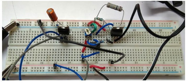 該電路在面包板中構(gòu)建,并使用工作臺電源以及可變直流負(fù)載進(jìn)行測試。