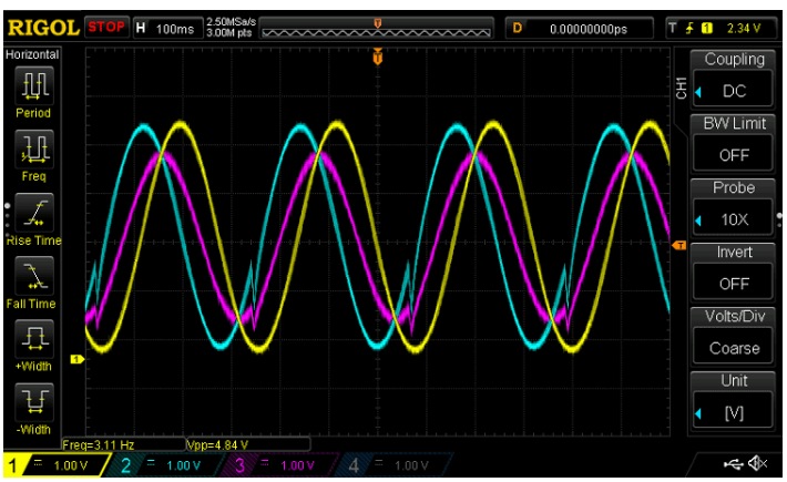 兩個相移正弦波被送入輸入(由黃色和藍(lán)色跡線顯示),輸出在下圖中顯示為粉紅色,與示波器的數(shù)學(xué)乘法函數(shù)相比,其輸出是紫色跡線。