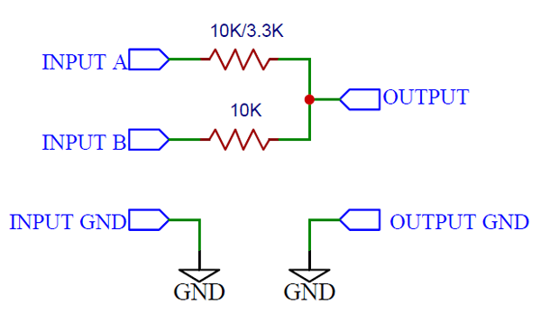 使用兩個10K電阻,輸出僅僅是輸入信號的總和。A和B都是統(tǒng)一的,因?yàn)閮蓚€標(biāo)度電阻是相同的。