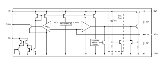 穩(wěn)壓器有三個主要組成部分,即通過元件、誤差放大器和參考電壓源。通常通通元件是n溝道或p溝道場效應管,但在MIC29302穩(wěn)壓器中,它是PNP晶體管。輸入電壓加到連接到誤差放大器的PNP晶體管上。該晶體管在線性區(qū)/有源區(qū)工作,將輸入電壓降低到所需的輸出電壓。誤差放大器檢測產生的輸出電壓并將其與參考電壓進行比較。誤差放大器將晶體管改變到適當的工作點,以確保輸出處于正確的電壓。當輸入電壓改變時,誤差放大器調制晶體管以保持恒定的輸出電壓。