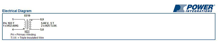 如上圖所示,我們需要在主側(cè)使用單個(gè)32 AWG線103圈,在次側(cè)使用兩個(gè)25 AWG線5圈。