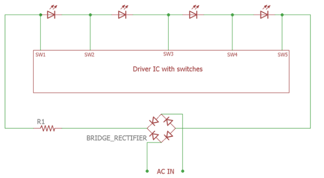 在上圖中,led以反平行的方式連接。在每一個(gè)正循環(huán)中,一對(duì)的一邊是正向偏置,另一邊是反向偏置,但在負(fù)循環(huán)中,狀態(tài)改變,其他led亮起。這里的電流受到一個(gè)高功率電阻R1的限制。