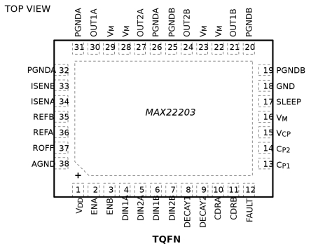 MAX22203具有過流保護(OCP)、熱關(guān)斷(TSD)和欠壓閉鎖(UVLO)功能。每次檢測到故障條件時,都會激活一個開漏低電平有效nFAULT引腳。在熱關(guān)斷和欠壓鎖定期間,驅(qū)動器為三態(tài),直到恢復(fù)正常工作為止。該期間采用小型TQFN38 5mm x 7mm封裝。