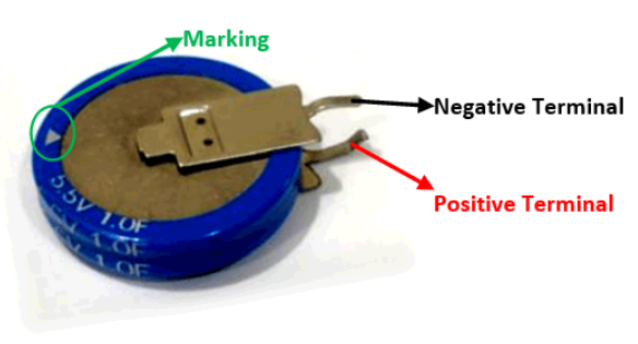 當涉及到電容器和電池時,我們應該非常小心它的極性。在最壞的情況下,極性相反的電容器很可能會發(fā)熱和熔化,有時會破裂。我們擁有的電容器是硬幣型的,其極性用白色的小箭頭表示,如下所示。