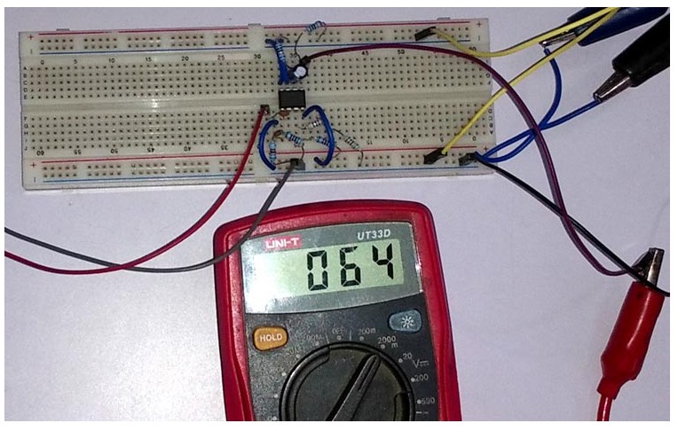 萬用表的輸出顯示的是計算值。當(dāng)輸入端提供500 Hz方波時,電路輸出64 mV。