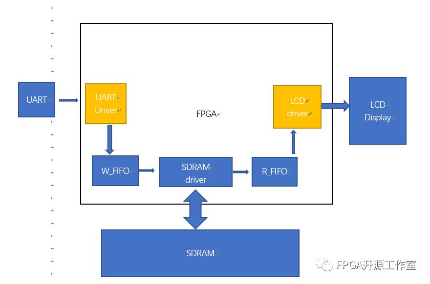 如上所示,F(xiàn)PGA模塊包括串口驅(qū)動(dòng)模塊,讀寫FIFO,SDRAM驅(qū)動(dòng),以及LCD驅(qū)動(dòng)。
