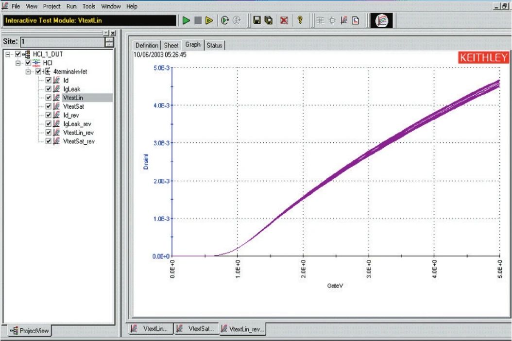 4200A-SCS的公式編輯器工具大大簡化了這些參數(shù)的提取。內(nèi)置函數(shù)包括微分獲得GM,MAX函數(shù)獲得最大的GM(Gmext),以及最小二乘線擬合函數(shù)提取VTH(Vtext)。計(jì)算這些參數(shù)的公式可以在4200A-SCS提供的HCI項(xiàng)目中找到,并在測試庫中的相應(yīng)的測試中找到。這些公式的一些例子包括: