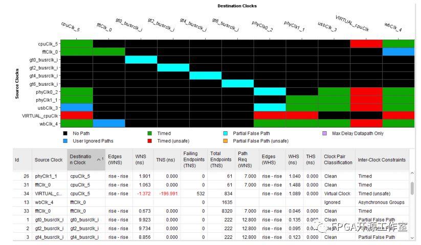 B,Timed -- 用綠色框來表示:源時(shí)鐘和目標(biāo)時(shí)鐘具有同步關(guān)系,并安全地被約束在一起。當(dāng)兩個(gè)時(shí)鐘具有共同的主時(shí)鐘和簡(jiǎn)單的周期比時(shí),該狀態(tài)由定時(shí)引擎確定。