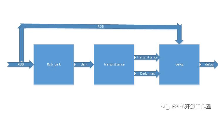 如圖4所示,將整個圖像去霧算法分為三個模塊以流水線的方式完成FPGA的圖像去霧算法:
