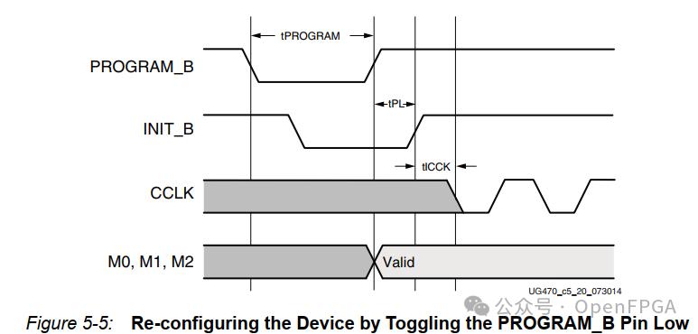 7 系列FPGA提供了一種通過(guò)外部引腳來(lái)重新配置FPGA的方式,這個(gè)引腳就是Program_B,通過(guò)拉低Program_B管腳重新配置FPGA,后續(xù)等INIT_B釋放拉高后,就和上面步驟一樣了。7系列FPGA通過(guò)Program_B復(fù)位加載時(shí)序如圖9所示。