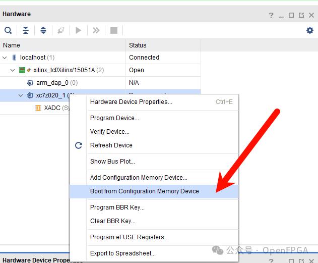 Program_B復(fù)位加載是通過(guò)外部引腳進(jìn)行重加載過(guò)程,AMD-Xilinx還提供一種指令加載方式就是-Boot加載。Boot加載過(guò)程實(shí)際上是通過(guò)JTAG發(fā)送JProgram指令,實(shí)現(xiàn)FPGA加載功能。JTAG發(fā)出JProgram指令后,等到待INIT_B釋放拉高后,就和上電自動(dòng)加載后續(xù)過(guò)程一樣。其功能和拉低Program_b功能相似,Boot加載操作如圖10所示。