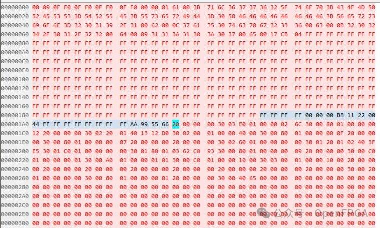 下圖為一個(gè)bit文件,圖中陰影部分就與上述中的總線寬度模式以及同步字等一一對(duì)應(yīng),同步字之后才是FPGA設(shè)計(jì)功能的配置內(nèi)容。