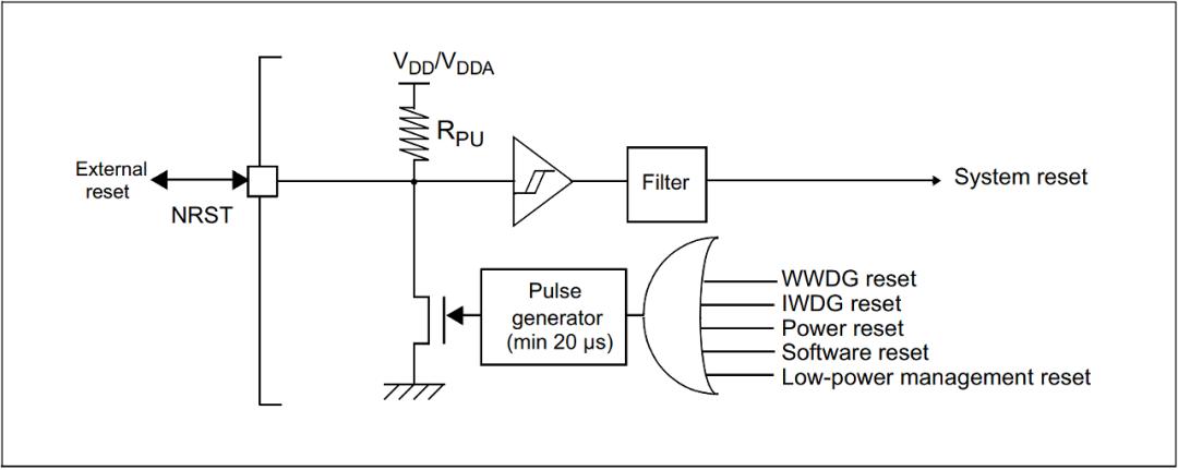 由上圖可以看出來,NRST引腳、看門狗等各種事件最終都能引起系統(tǒng)復(fù)位。