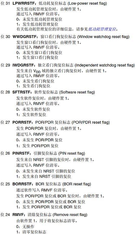 為了方便軟件工程師調(diào)試和查找(復(fù)位)問題,STM32設(shè)計(jì)有個(gè)狀態(tài)寄存器保存了各種復(fù)位來源的狀態(tài)。