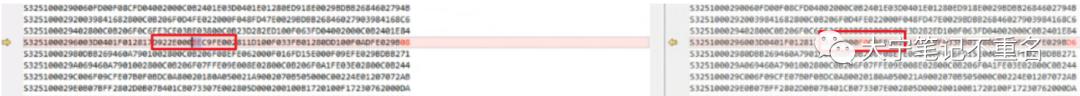 考慮到上述的調(diào)試操作都是在Attach方式,不存在因?yàn)榇a下載導(dǎo)致Flash內(nèi)容被修改的可能,那可能只有兩個(gè):IDE解析錯(cuò)誤以及代碼被意外修改,顯然前者是個(gè)死胡同,無(wú)從查起。于是順著第二條路Dump芯片內(nèi)二進(jìn)制(左側(cè))和原始二進(jìn)制文件(右側(cè))對(duì)比發(fā)現(xiàn)兩者Flash確實(shí)有差異。如下圖所示,F(xiàn)000的值被修改成了BE00,同時(shí)處理CRC校驗(yàn)值也被修改,So什么原因?qū)е翭lash被修改了呢?