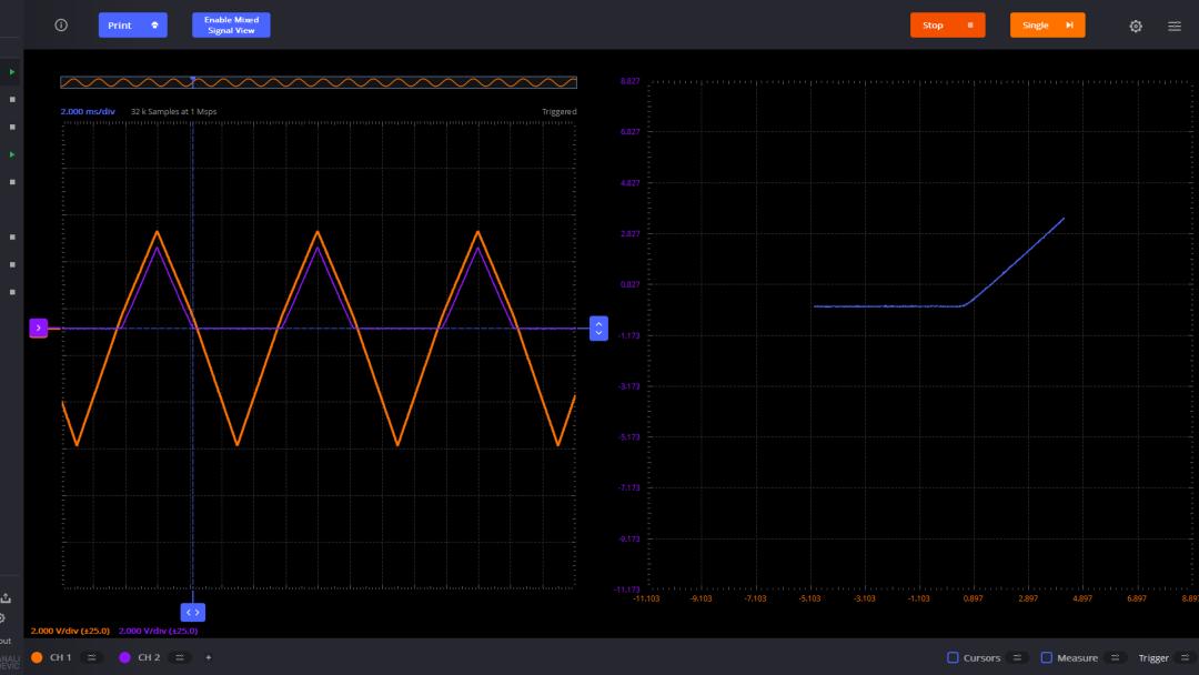 使用 ADALM2000 產(chǎn)生鋸齒波形,使用通道1 測(cè)量該信號(hào)。簡(jiǎn)單起見,通道2 也測(cè)量該鋸齒波。它們分別作為 X-Y 電壓驅(qū)動(dòng)信號(hào)。左邊顯示了兩個(gè)通道的波形。右邊這是 X-Y 對(duì)應(yīng)的波形,因?yàn)樗鼈?是同一個(gè)信號(hào),所以對(duì)應(yīng)這45°的直線。這是測(cè)量恒等系統(tǒng)的輸入輸出關(guān)系。