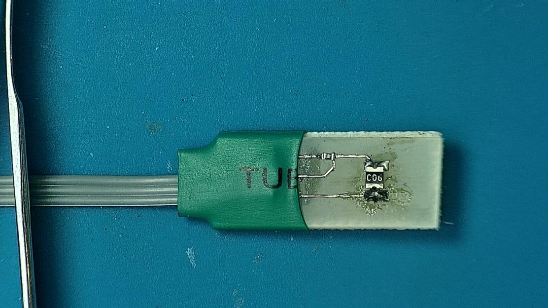 使用LCR 鑷子測量 C06的阻抗。平時的時候兩端是開路的。這是在靜止的狀態(tài)下,C06的導(dǎo)通狀態(tài)。下面將其焊接在電路板上,測量振動狀態(tài)下的導(dǎo)通情況。