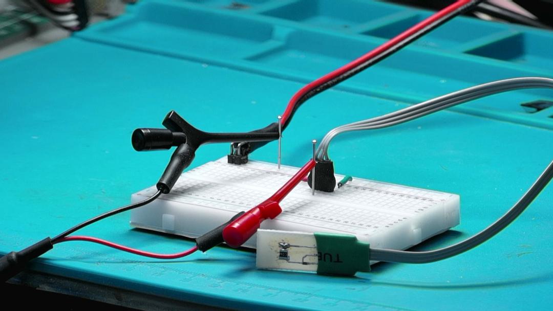利用面包板搭建測量電路。在電阻與 C06串聯(lián)兩端接入 5V電壓。利用示波器測量 C06上的分壓電壓波形。在靜止狀態(tài)下,可以看到 C06是開路狀態(tài),分壓信號為高電平。電壓大小是電源電壓5V。