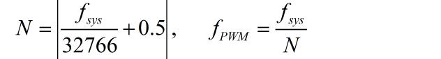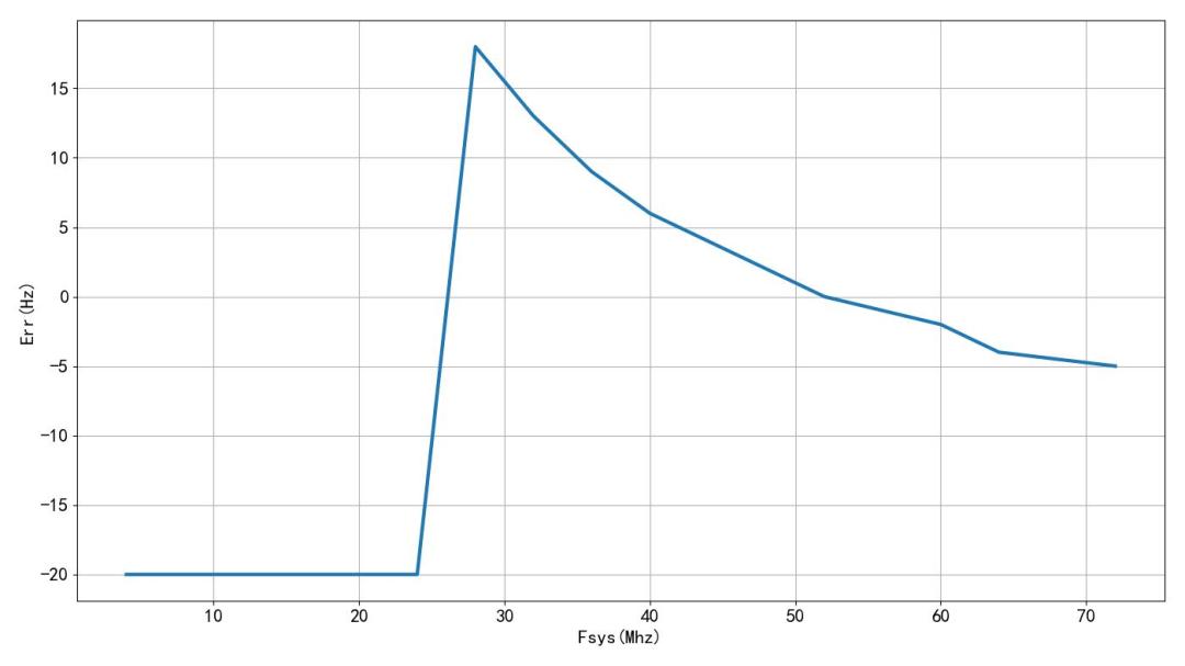 這里給出了不同的系統(tǒng)時(shí)鐘下,計(jì)算出來 PWM 頻率與所設(shè)定的 中心頻率之間的誤差??梢钥吹皆谙到y(tǒng)時(shí)鐘為 52MHz的時(shí)候,經(jīng)過分頻之后所得到的 PWM 的頻率和 32.766kHz 的誤差可以達(dá)到 0Hz。