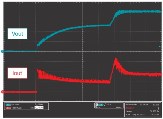 圖 7中的波形顯示了啟動期間啟用頻率鉗位時電源的輸出電壓 (10V/div) 和電機(jī)的電流需求 (10A/div)。峰值電流略高于 35 A,更接近電機(jī)的 25 A 標(biāo)稱額定值。電機(jī)開始轉(zhuǎn)動后3秒內(nèi)電機(jī)電流達(dá)到穩(wěn)定狀態(tài)。