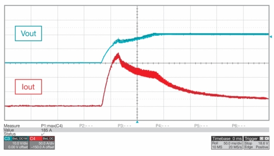 上述電路使 500W 連續(xù)導(dǎo)通模式 (CCM) PFC 升壓轉(zhuǎn)換器和隔離式半橋 LLC 轉(zhuǎn)換器參考設(shè)計能夠成功啟動車間真空吸塵器并為其供電。圖 6所示的波形說明了無頻率鉗位時電源的輸出電壓 (10 V/div) 和電機(jī)的電流需求 (50 A/div)。電機(jī)的峰值電樞電流為 186 A。在電機(jī)開始轉(zhuǎn)動后 300 ms 內(nèi)穩(wěn)定到 25 A 的穩(wěn)態(tài)電流之前,存在 200 ms 的顯著電流應(yīng)力。
