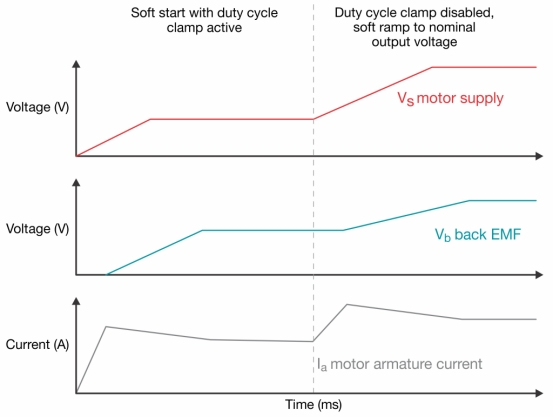 使用鉗位器可以在足夠長的時間內(nèi)在隔離式 DC/DC 轉(zhuǎn)換器的輸出上形成一個小的初始電壓,從而使電機(jī)緩慢轉(zhuǎn)動并開始產(chǎn)生反電動勢,如圖3所示。由于初始電源電壓較小,電機(jī)的電流需求被限制為更接近其穩(wěn)態(tài)值的值。產(chǎn)生反電動勢并且電機(jī)電流達(dá)到穩(wěn)定狀態(tài)后,隔離式 DC/DC 的輸出電壓可以安全地升至標(biāo)稱輸出電壓,同時避免轉(zhuǎn)換器內(nèi)出現(xiàn)過大的電流應(yīng)力。