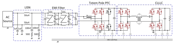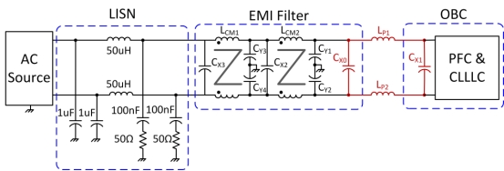 EMI 包括差模 (DM) 和共模 (CM) 噪聲。對(duì)于 OBC 系統(tǒng),DM 噪聲主要由功率因數(shù)校正 (PFC) 的輸入電流產(chǎn)生,而 CM 噪聲則可能由 PFC 和導(dǎo)體-電感器-電感器-電感器-電容器 (CLLLC) 產(chǎn)生。圖 1原理圖右下角顯示了 OBC 的冷卻解決方案(冷板)。冷板對(duì)于防止組件過熱至關(guān)重要;然而,它的存在會(huì)引入影響 EMI 的寄生電容。