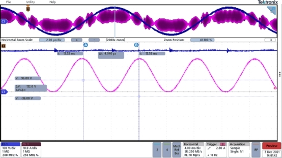 圖 4顯示了流經(jīng) L P1 的交流線路電流的時(shí)域波形(洋紅色)。