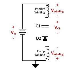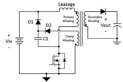 實(shí)現(xiàn)該鉗位需要在變壓器的初級(jí)側(cè)添加鉗位繞組。該繞組必須具有與初級(jí)繞組相同的匝數(shù)。添加了一個(gè)鉗位電容器,連接到 FET 的漏極。鉗位電容器的另一端通過(guò)二極管 D1 鉗位至輸入電壓,并通過(guò)二極管 D2 鉗位至鉗位繞組。