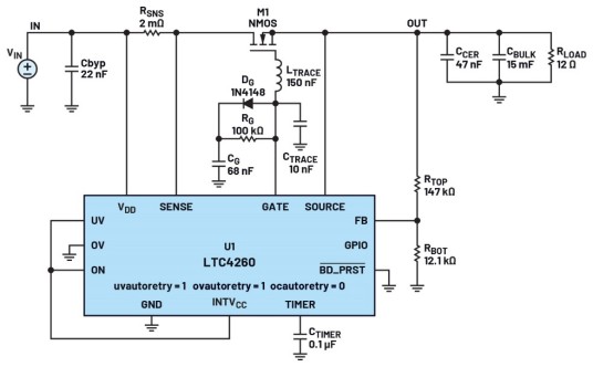 ? LTRACE是150 nH分立電感,位于LT4260的GATE引腳和NFET的柵極之間,代表走線電感。