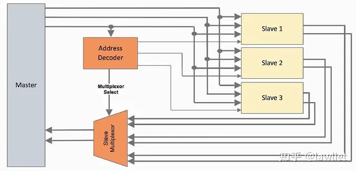 除了Master和Slave,總線中一般還包括哪些組件呢?比如有多個(gè)Slave的時(shí)候,那么自然要確定你的命令是發(fā)給哪個(gè)Slave的,這個(gè)時(shí)候我們就需要地址譯碼器。而當(dāng)Slave返回?cái)?shù)據(jù)的時(shí)候,Master需要知道是哪個(gè)Slave回的數(shù)據(jù),因此還需要MUX選擇器。