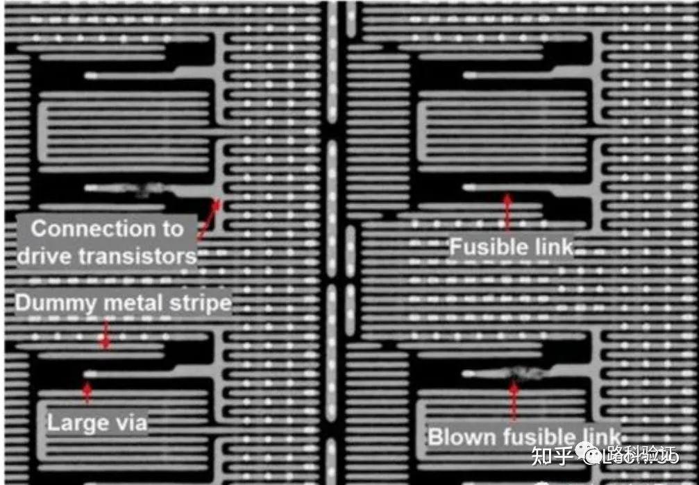 3)安全性,Antifuse 比eFuse 的安全性更好,在顯微鏡下也無法區(qū)別編程位和未編程位,因此無法讀取編程數(shù)據(jù)。在多晶硅柵CMOS 工藝中,多晶硅eFuse 應(yīng)用廣泛,EM 發(fā)生在硅化物層。然而在MOSFET 工藝中,用high-k 材料做金屬柵極( HKMG ), 沒有多晶硅層可用作eFuse, 因此改用金屬層作eFuse。不論哪種eFuse 在顯微鏡下都可以區(qū)別出編程位和未編程位,而Antifuse 不僅在顯微鏡下無法窺探到編程信息,通過FIB 也檢測不到電壓熱點,這使得未經(jīng)授權(quán)的用戶很難獲得存儲在Antifuse內(nèi)存中的數(shù)據(jù)。