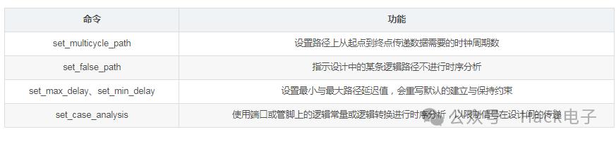 英文名為Timing Exception,可以認(rèn)為是時(shí)序例外或時(shí)序異?!袄狻被颉爱惓!笔侵高@部分時(shí)序的分析與大多數(shù)常規(guī)時(shí)序分析不同。下表給出了Vivado支持的時(shí)序異常命令及功能: