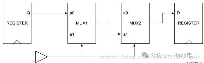 兩個(gè)多路選擇器MUX控制兩個(gè)寄存器間的數(shù)據(jù)傳輸,但是兩個(gè)MUX采用同一個(gè)選擇信號(hào)。仔細(xì)分析會(huì)發(fā)現(xiàn),無論如何Q端數(shù)據(jù)都無法傳遞到D端。雖然結(jié)構(gòu)圖上看起來Q和D之間存在一條路徑,但是沒有起到任何功能,因此應(yīng)該定義為虛假路徑。