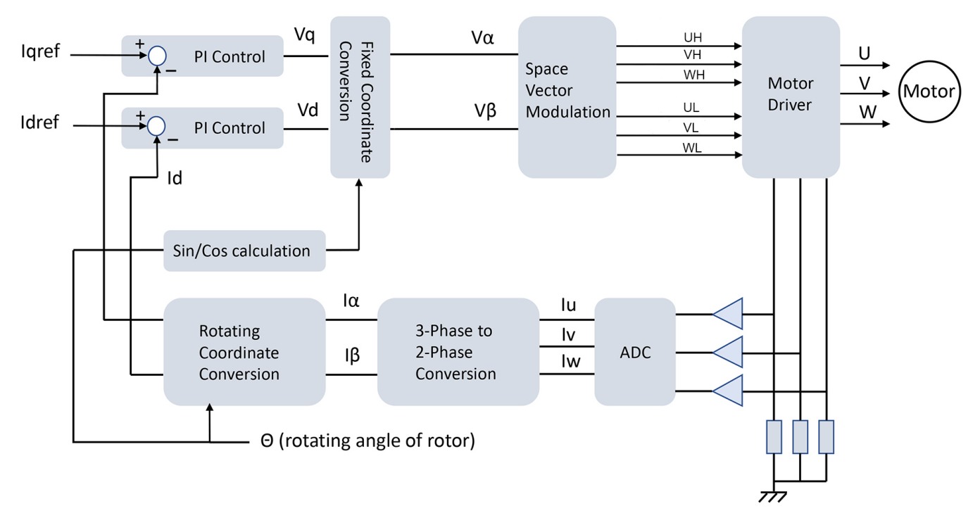 FOC 中必須知道轉(zhuǎn)子角位置才能解析 Id 和 Iq 分量。還需要測量定子繞組電流。