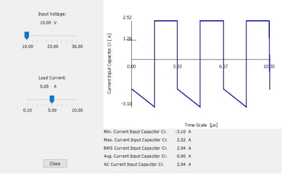 圖 2 TI 的 Power Stage Designer 軟件顯示輸入電容器紋波電流和計(jì)算出的 RMS 電流。