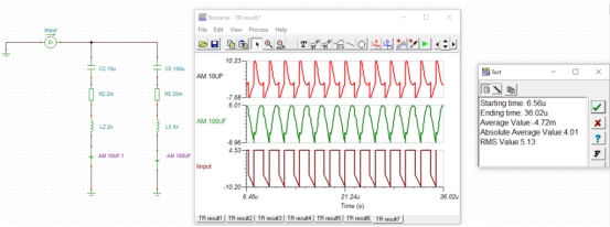 TINA-TI 軟件可以通過以下方式計(jì)算每個電容器支路中的 RMS 電流:運(yùn)行仿真,單擊所需的電流波形將其選中,然后從波形窗口的 Process 菜單選項(xiàng)中選擇 Averages。 TINA-TI 軟件使用模擬開始和結(jié)束顯示時間的數(shù)值積分來計(jì)算 RMS 電流。